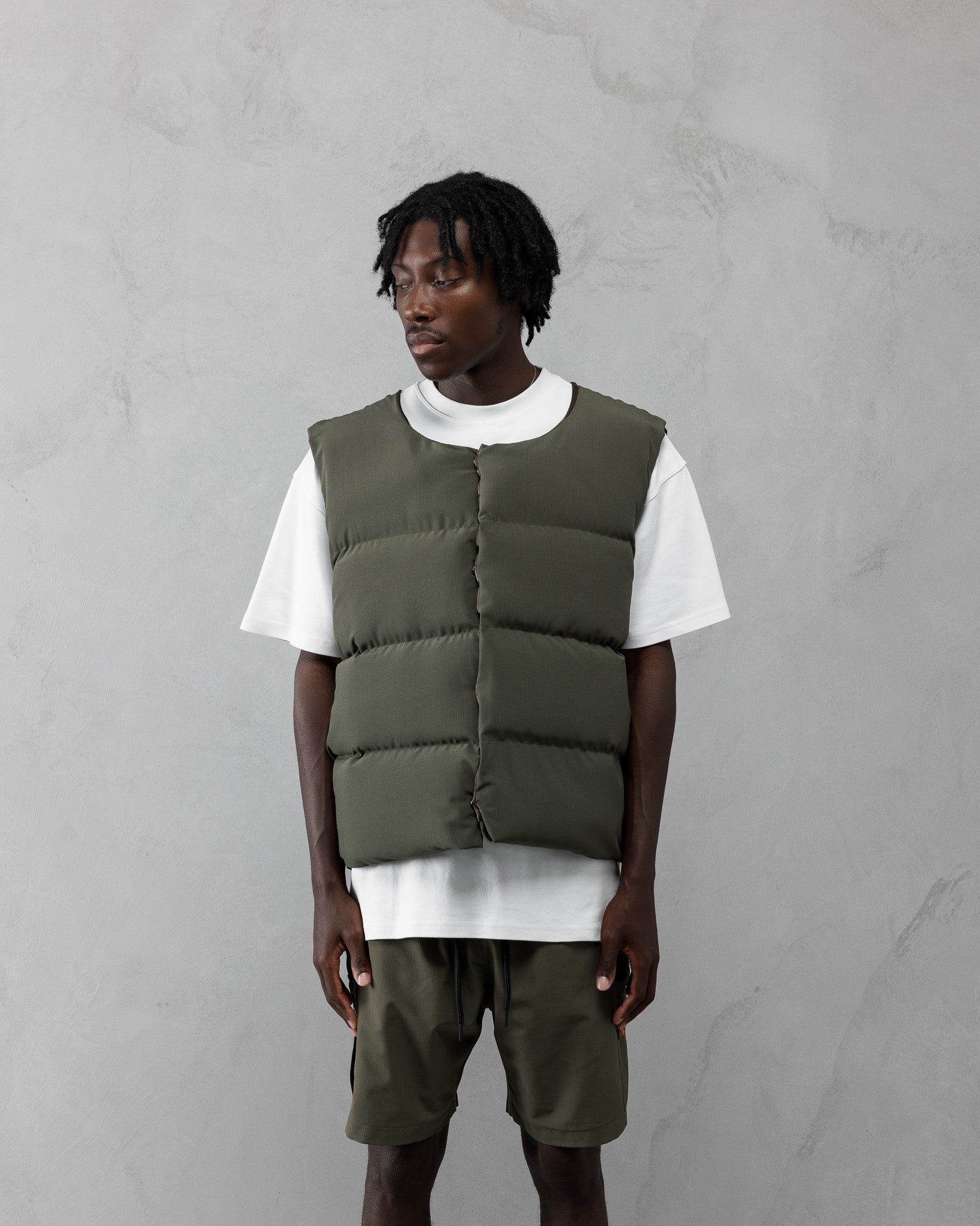Expertly crafted with AJ Tech Fabric, this Khaki Puffer Vest & Pant offers the perfect combination of lightweight comfort and heavyweight style. Designed with an oversized cropped fit, the puffer can be easily layered for any occasion. Whilst these pants feature utility details, CS orange tab branding - with a zip finish to offer a relaxed or fitted feel to the cargos.
